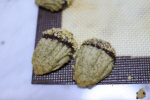 絞り出した紅茶クッキー生地を焼いてチョコレートと砕いたコーンフレークをまぶすと