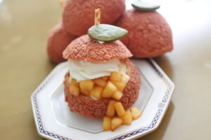 サクサクのクッキーシューにカスタードクリームと生クリーム、りんごのキャラメル煮がたっぷり!